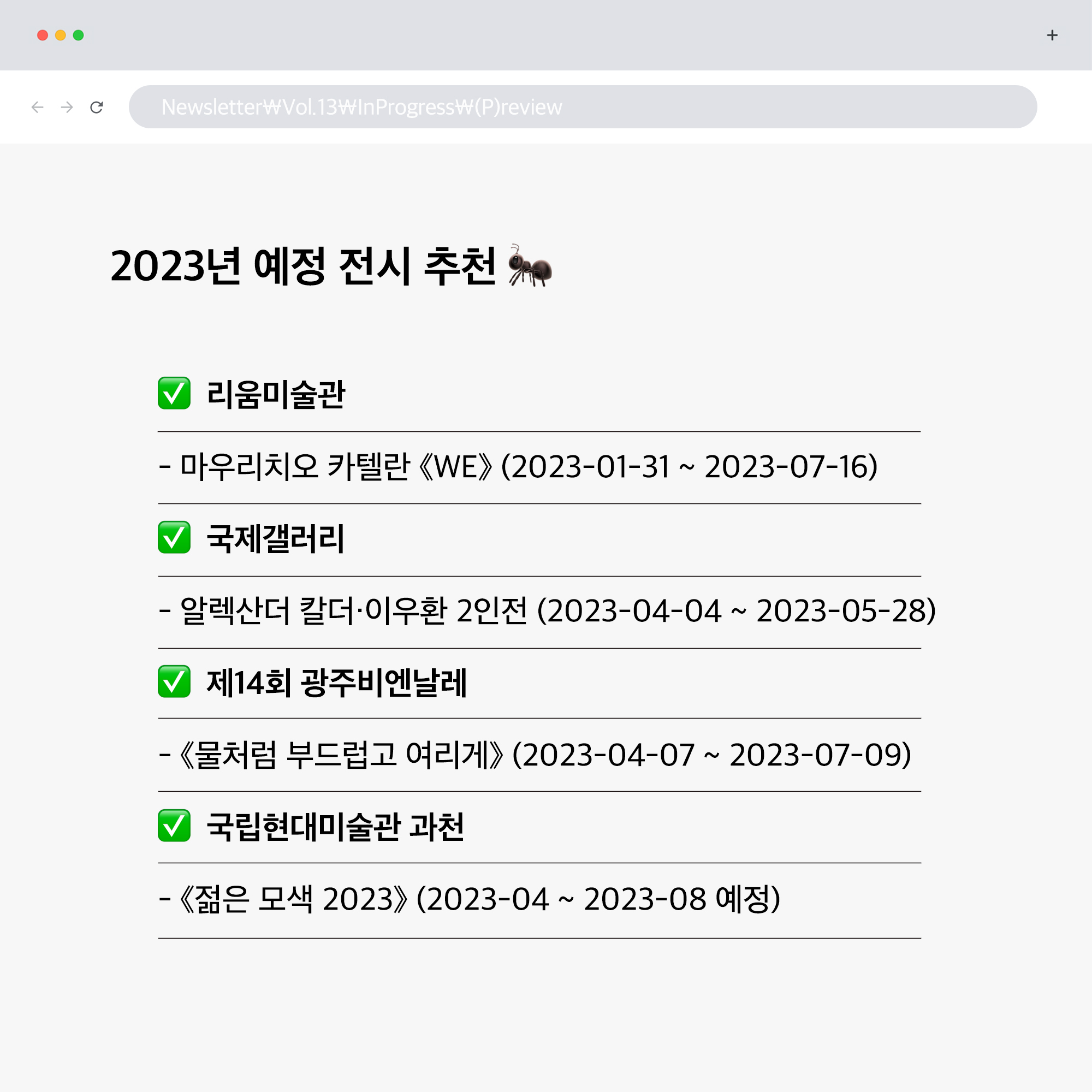 광주비엔날레가 올해 4월부터 개최됩니다. 이번 행사의 제목이자 주제는 ‘물처럼 부드럽고 여리게(soft and weak like water)’라고 해요. 문제의식을 섬세하고 깊숙이 건드리는 작품들을 만나볼 수 있을 거란 기대가 됩니다. 광주비엔날레는 2018년부터 국가관을 운영하는 프로젝트를 시작했는데, 이번에는 네덜란드, 스위스 등 9개국이 참여해요. 비엔날레와 같은 큰 규모의 미술 행사들은 으레 동시대의 이슈를 건드리며 열리는 곳의 지역성도 아우르곤 하죠. 이러한 이유로 올해 다영의 버킷리스트에는 ‘광주비엔날레에 가기’가 있답니다.