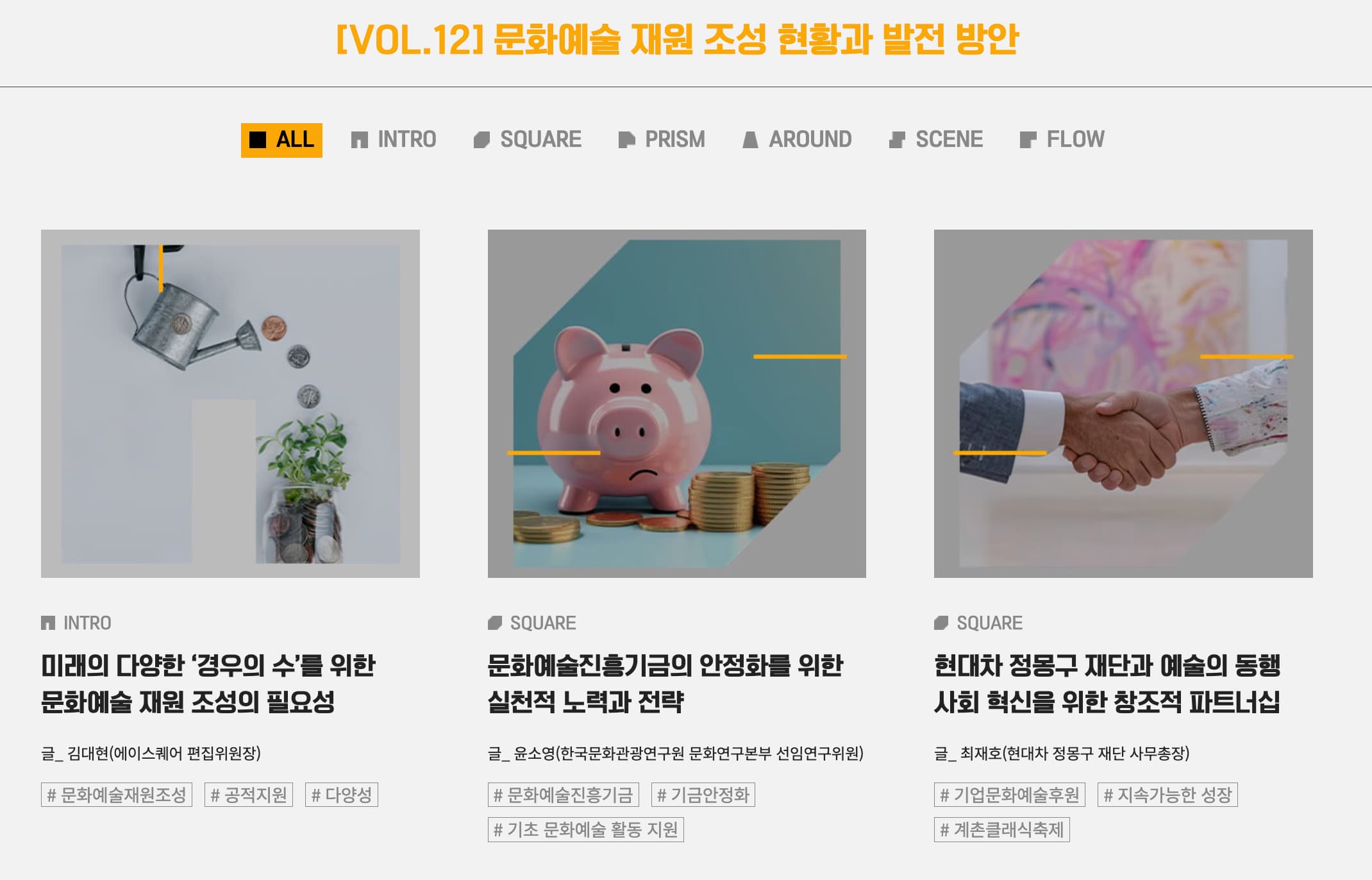 에이스퀘어는 한국문화예술위원회에서 운영하는 웹진으로, 주제에 따른 각종 아티클을 읽어볼 수 있습니다. 문화예술 정책, 나아가 예술계 전반의 이슈가 정갈하게 담겨 있어요. 재원 조성, 관객 개발, ... 이 웹진이 학교 다닐 때 있었더라면 참 좋았을 텐데.. 싶습니다.