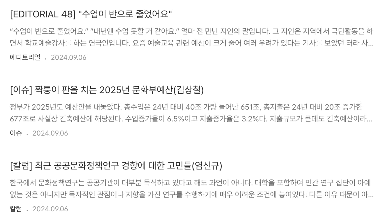 문화예술 정책에 관한 전문적인 견해를 읽고 싶을 땐, 문화정책리뷰에 들어가 봅니다. 조금은 날 서고도 뾰족한 글들이 실려 있거든요. 2024년 문화예산 분석 특집을 인상 깊게 읽었는데, 2025년 예산이 확정되면 또 어떤 분석을 내놓으실지 기다려집니다. |