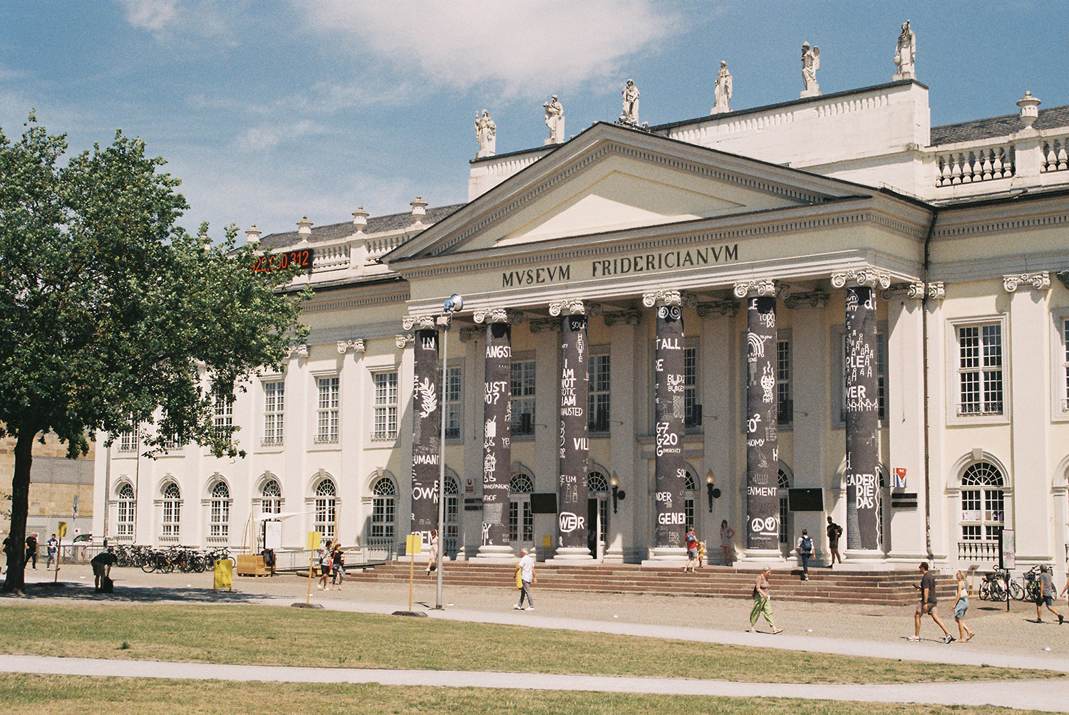 안녕, 나 다영이야. 잘 지내지? 너도 알다시피 도큐멘타를 보러 독일 카셀에 다녀왔어. 전시장(venue)들이 네 개 지역(area)으로 나누어져서 카셀 이곳저곳에 흩어져 있더라. 나는 여덟 군데 정도를 둘러봤는데, 가장 마음에 들었던 장소는 Fridericianum이었어. 기둥(column)을 새하얀 건물의 색과 대조되는 검은색으로 칠한 다음 평화, 지속가능성 등의 의미가 담긴 그림을 그려놓은 작업이 기억에 남았거든. Fridericianum은 앞에 큰 광장이 있고 주변의 어느 전시장을 가든 이 앞을 지나가게 돼. 그래서 이 작업이 이번 도큐멘타의 방향성을 잘 드러내준다고 생각했어. 게다가 이런 건축물은 보통 하얀색인데 까맣게 칠해져 있으니 우위에 있는 이념이 전복되는 듯한 통쾌한 느낌이 들더라.